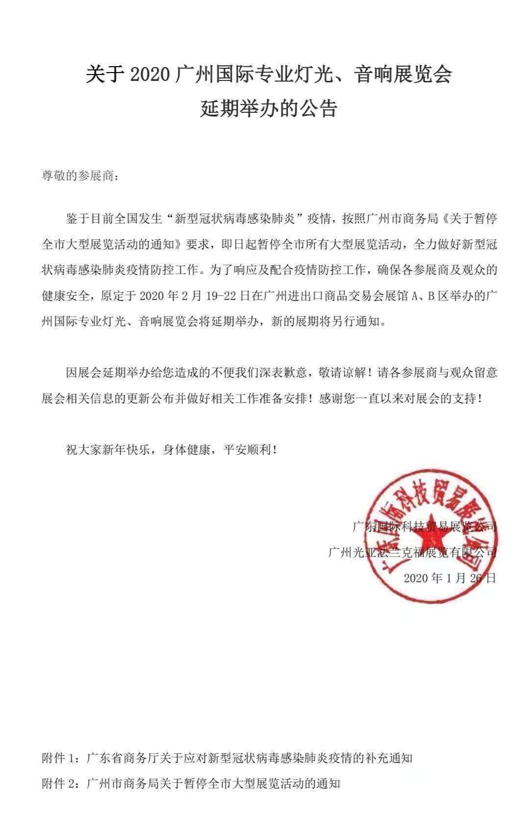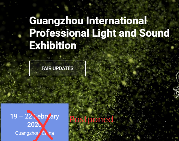 "Due to the current national "new coronavirus infection pneumonia" outbreak, to comply with with the government's request, from now on temporarily suspended all large-scale exhibition activities in Guangzhou City. In order to support and comply with the prevention and control of the epidemic, also ensure the health and safety of exhibitors and visitors, the 2020 Guangzhou prolight sound exhibition scheduled from 19th to 22nd Feb has been postponed. The new opening date will be announced in the future.. We do apologize for the inconvenience. Exhibitors and visitors are invited to pay attention on the update of the relevant information of the exhibition and make preparations for the relevant work. Thank you for your continued support." Official announcement of Guangzhou Messe Frankfurt