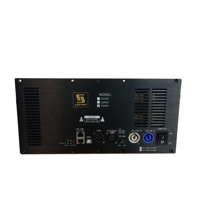 D2000 series powered speaker module consists of class D amplifier board; switching power supply and DSP module, it has 3 models : D2450; D2650; D2800. The design of this 2 channel series amplifier module is based on the D1 series single channel powered module, to fulfill specific requirements for more compact high powered speaker cabinets.